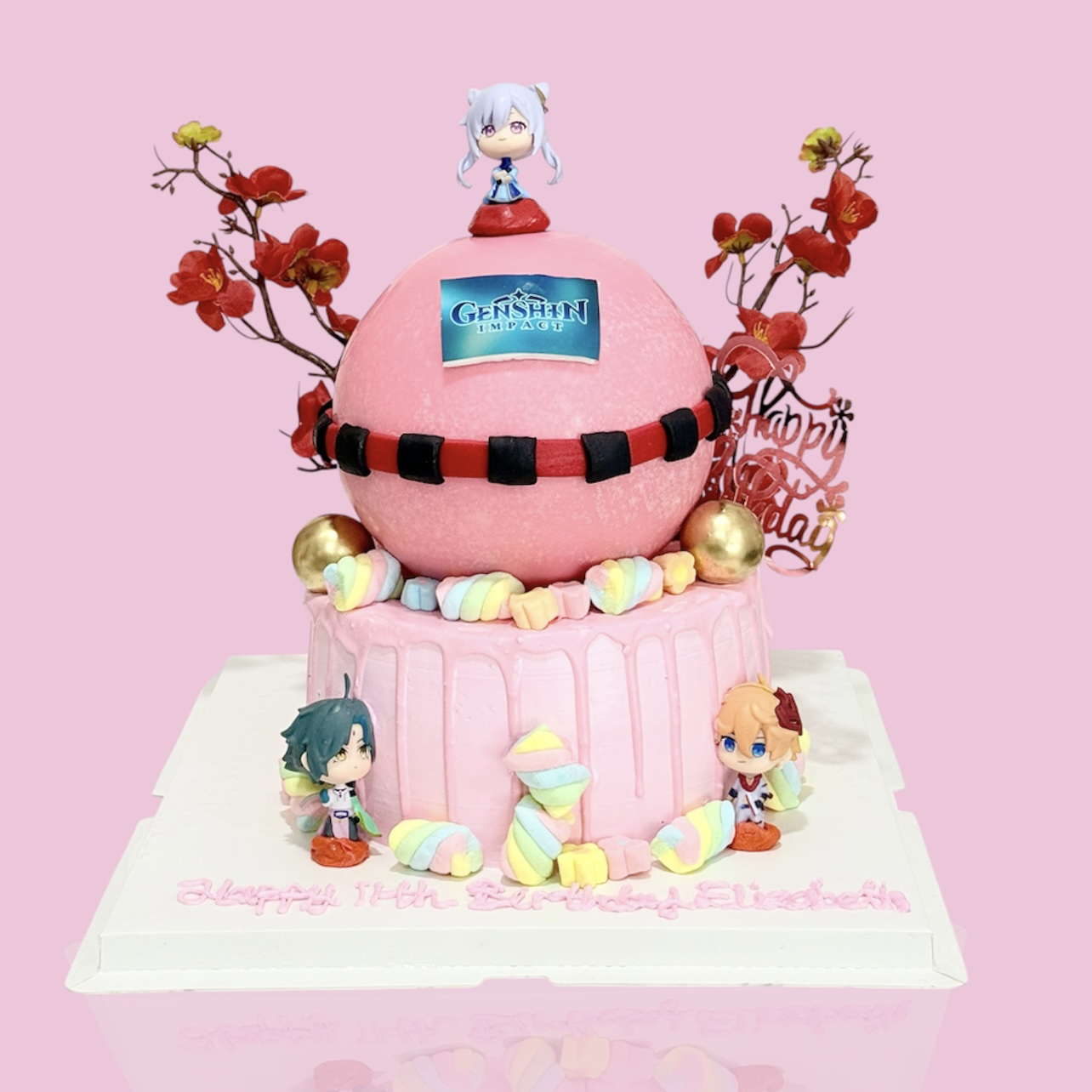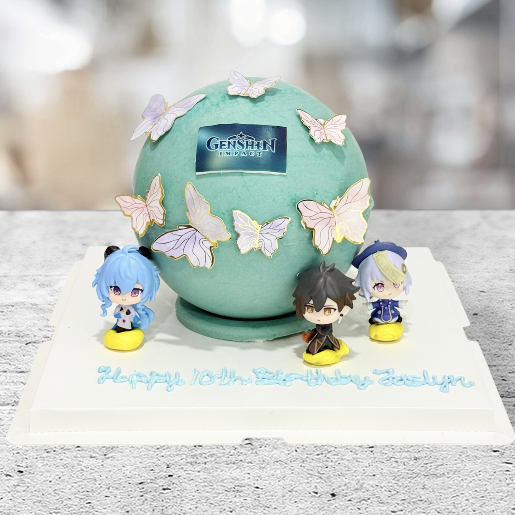 • Vibrant colors, iconic elements — it’s Genshin Impact’s essence in a cake, bursting with excitement.