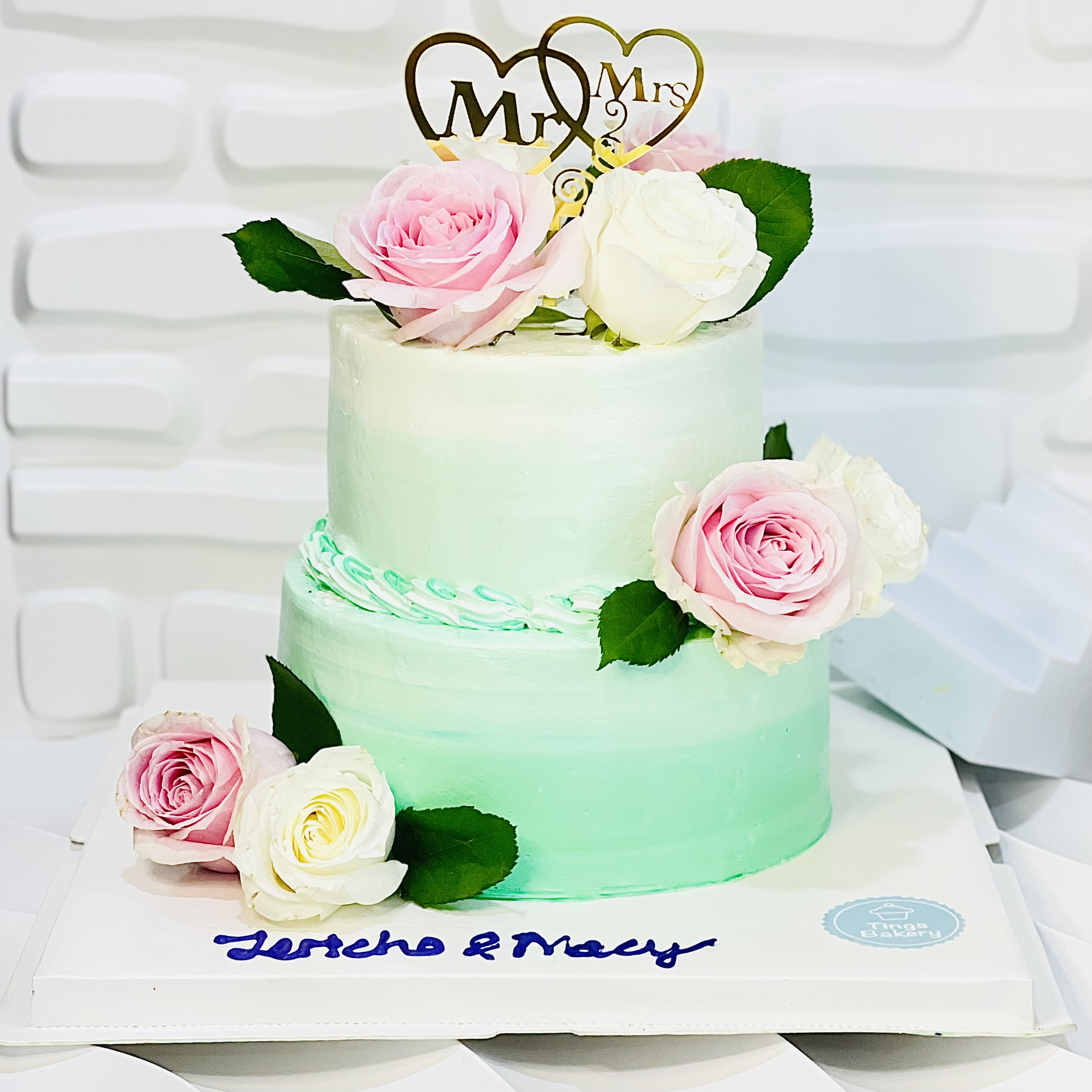 Elevate your wedding celebration with Ting’s Bakery Green Ombre Wedding Cake with Flowers! 💙🎂 Meticulously crafted and filled with romantic charm, this stunning cake is the perfect centerpiece for your special day, capturing the essence of love and elegance.