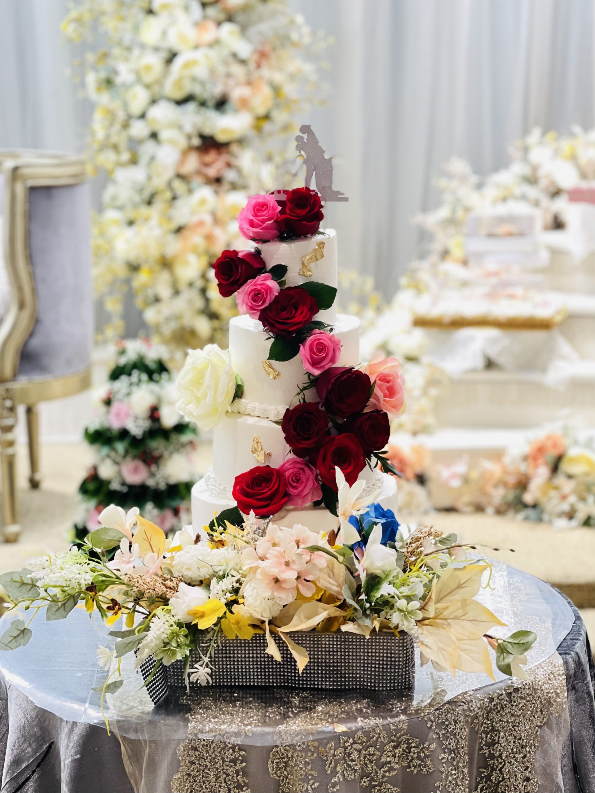 🌹 Red Roses, the Language of Love: The red roses adorning the cake symbolize love, passion, and the profound connection between the couple. Each rose is meticulously placed, creating a visual poetry that tells the story of the couple’s blossoming romance.